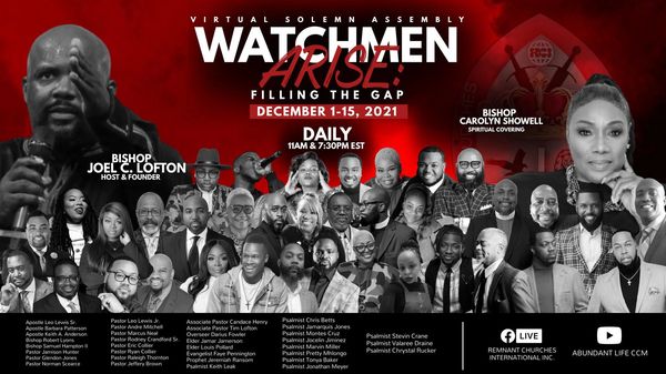 Remnant Churches International, Inc., invites you to tune into the 2021 Virtual Solemn Assembly, WATCHMEN ARISE: FILLING IN THE GAP. RCI Founder, Bishop Joel C. Lofton will be your Host for fifteen days of Word and Worship. The services will take place daily at 11:00a.m. and 7:30p.m. and be streamed live via the Remnant Churches International Inc. Facebook page, the Abundant Life CCM YouTube Channel and here on the ALCCM website.